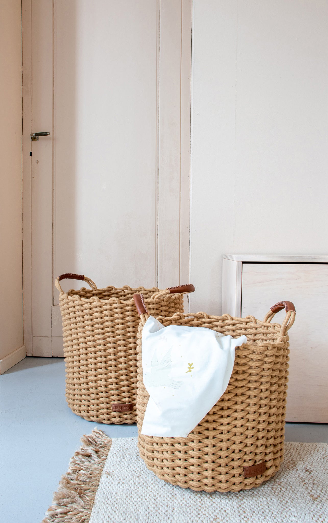 Korbo sæt opbevaringskurve er lavet af flettet snor med læderlook-håndtag. Kurvene er solide og af høj kvalitet og står stabilt, selv uden indhold.