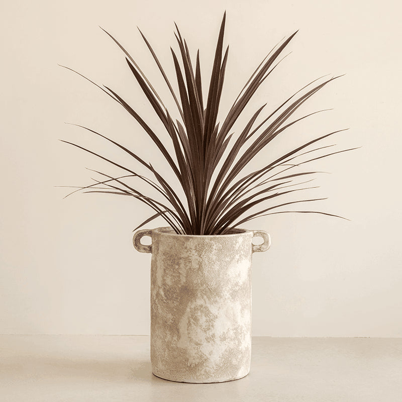 Krukken har en rå, taktil overflade og en organisk, jordnær struktur, der giver den et autentisk og tidløst udtryk. Dens naturlige farvetoner og urbane form gør den ideel til moderne hjem, hvor den tilfører ro, karakter og håndværksmæssig charme.