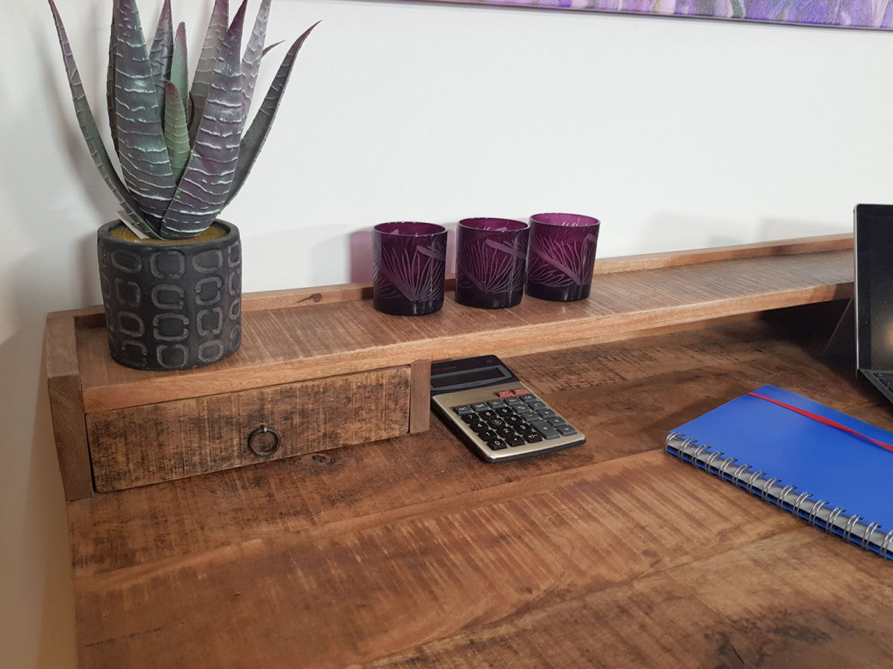 Et oplagt valg, hvis du ønsker et robust skrivebord i massivt træ med industrielt design og praktiske opbevaringsløsninger til hjemmearbejdspladsen.