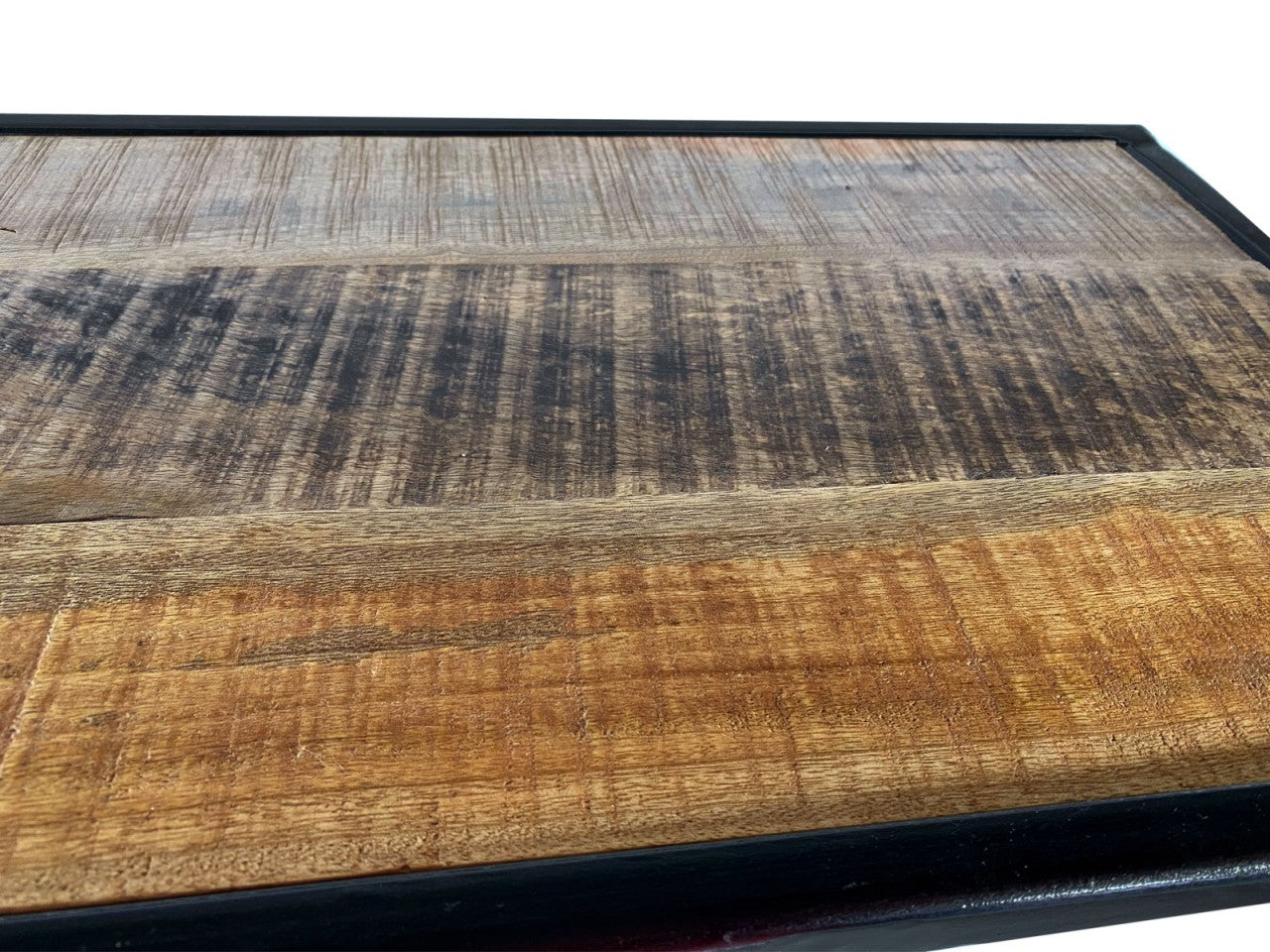 Reolen er fremstillet af genanvendt mangotræ og har synlige savspor og naturlige brugsmærker, som giver varme, karakter og et autentisk udtryk. Hver reol er håndforarbejdet og derfor helt unik.